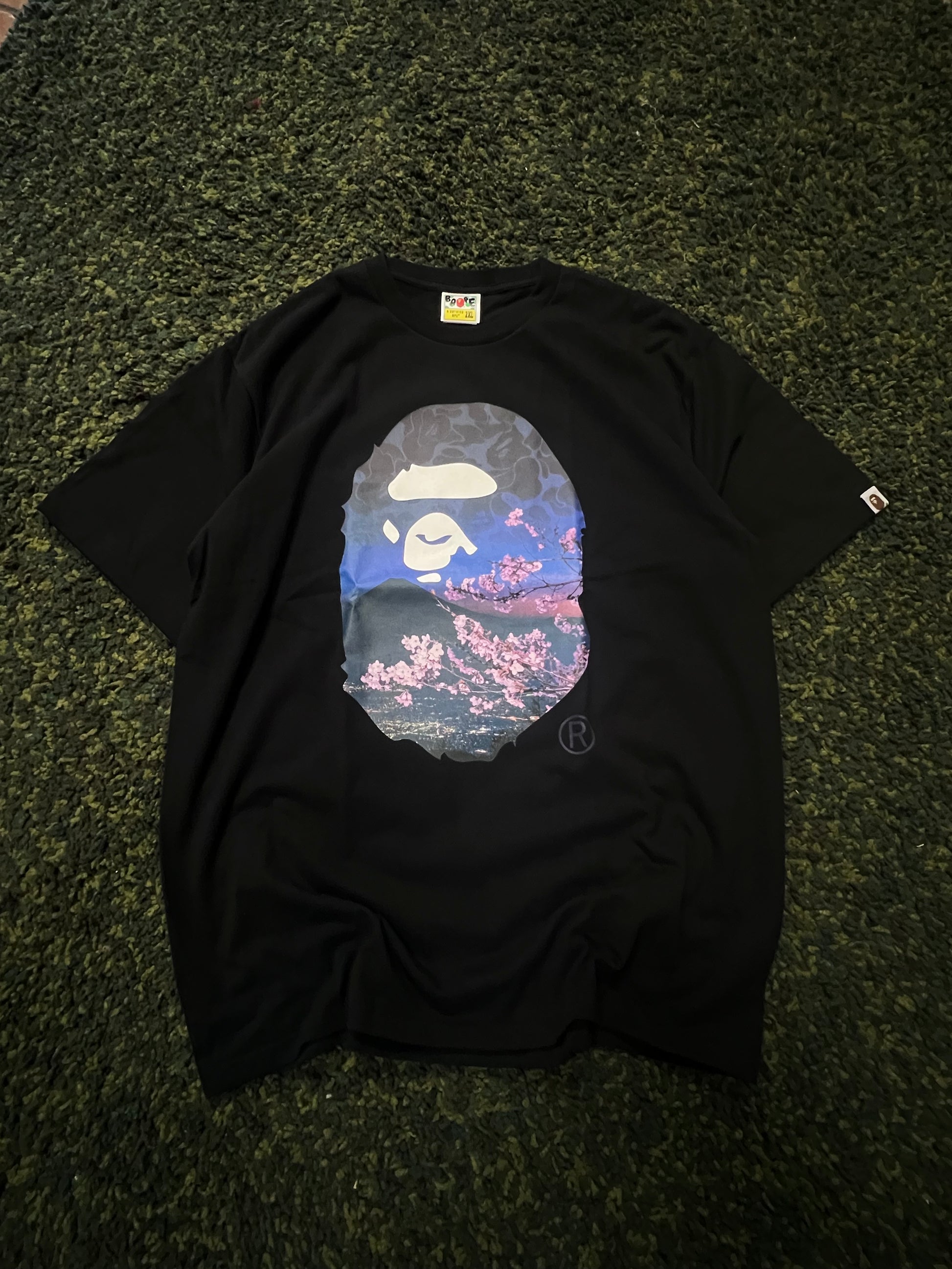 - Colorway/Design: Black tee with Ape Head logo featuring cherry blossom and skyline graphic